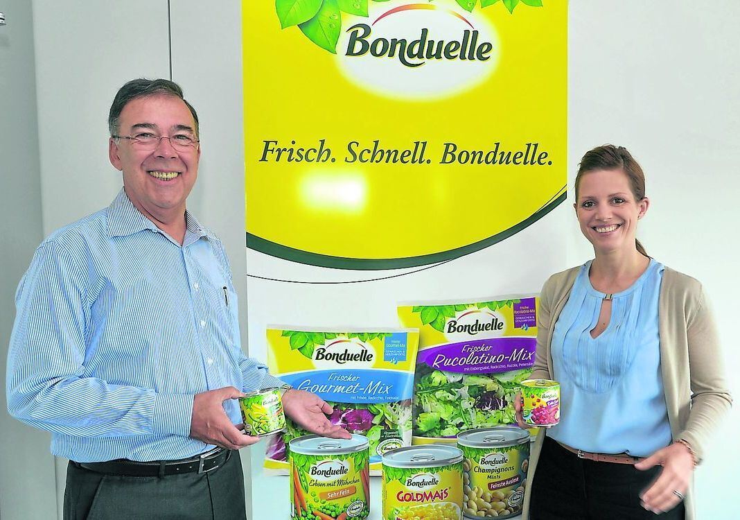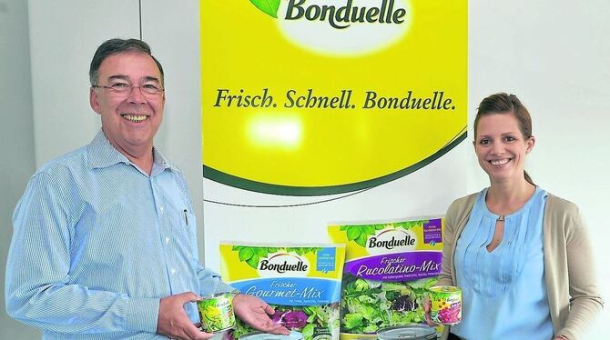 Rolf Darius, Geschäftsführer der Bonduelle Deutschland GmbH, und Nadja Ohlendorf, neue Marketingleiterin des Unternehmens, präsentieren am Firmensitz in Reutlingen servierfähig abgepackte Salate und Gemüsekonserven. FOTO: MARKUS NIETHAMMER