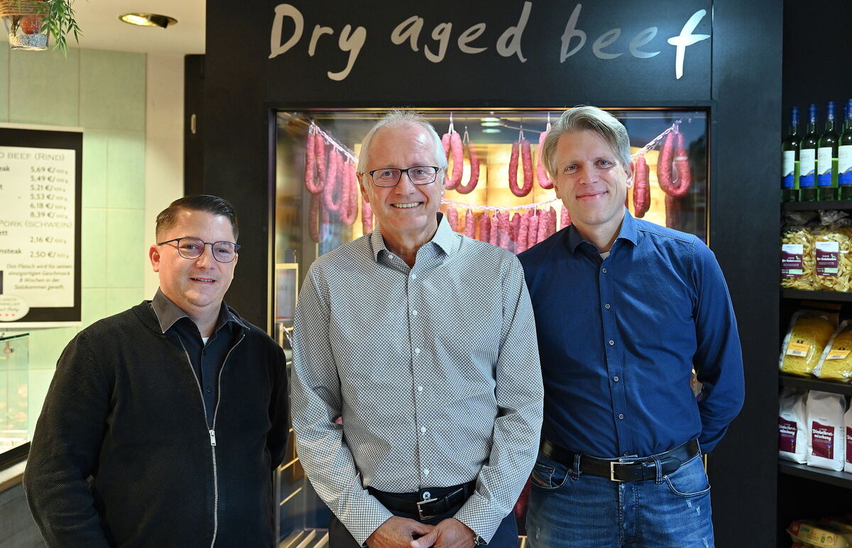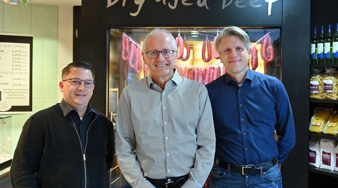 Bernhard Klein (rechts) hat von Jürgen Zeeb (Mitte) alle Anteile an der Reutlinger Metzgerei Oskar Zeeb GmbH und die Geschäftsführung des Unternehmens übernommen. Steffen Pelz, zuvor Prokurist, ist nun ebenfalls Geschäftsführer.