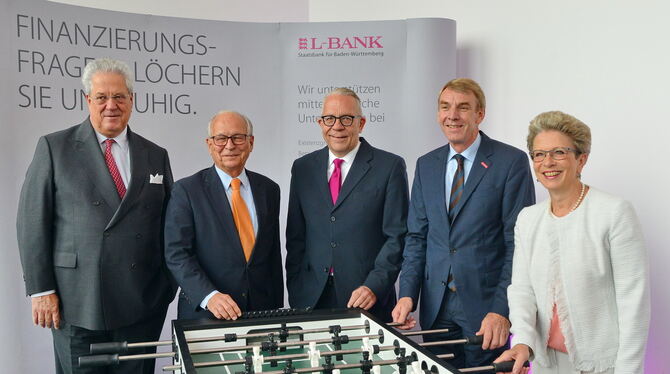 Wirtschaftsforum der L-Bank in der Stadthalle Reutlingen (von links): Thomas Lindner (Vizepräsident der Industrie- und Handelskammer Reutlingen), Botschafter Wolfgang Ischinger, L-Bank-Chef Axel Nawrath, Harald Herrmann (Präsident der Handwerkskammer Reutlingen) und die Reutlinger Oberbürgermeisterin Barbara Bosch. FOTOS: NIETHAMMER