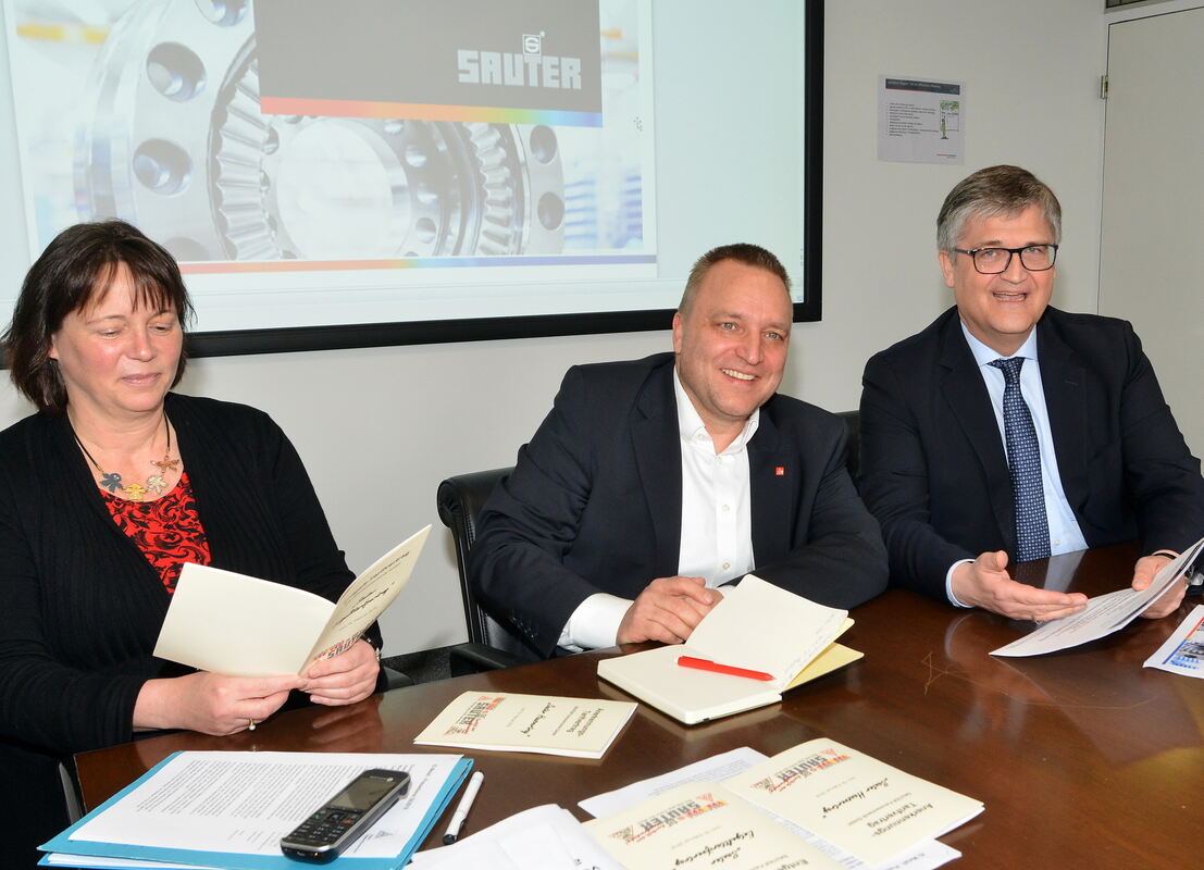 Vor einem Jahr herrschte noch Harmonie (von links): Betriebsratsvorsitzende Manuela Dankesreiter, Michael Bidmon (IG Metall) und Geschäftsführer Michael Frank Rudloff bei der Vorstellung der Ergebnisse der Tarifverhandlungen bei Sauter. ARCHIVFOTO: NIETHAMMER
