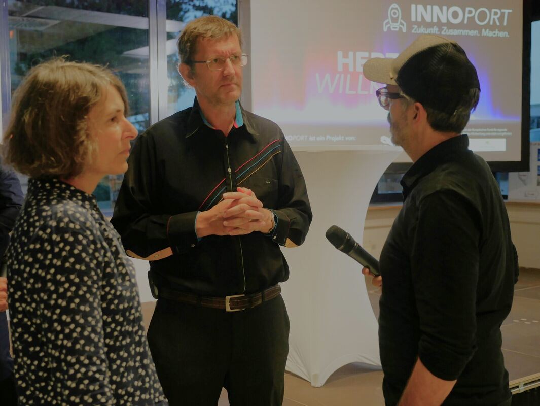 Der Schweizer Umweltaktivist Louis Palmer (Mitte) im Gespräch mit den Greentech-live-Organisatoren Jochen Siegle und Silvia Siegle-Kling. FOTO: LEISTER