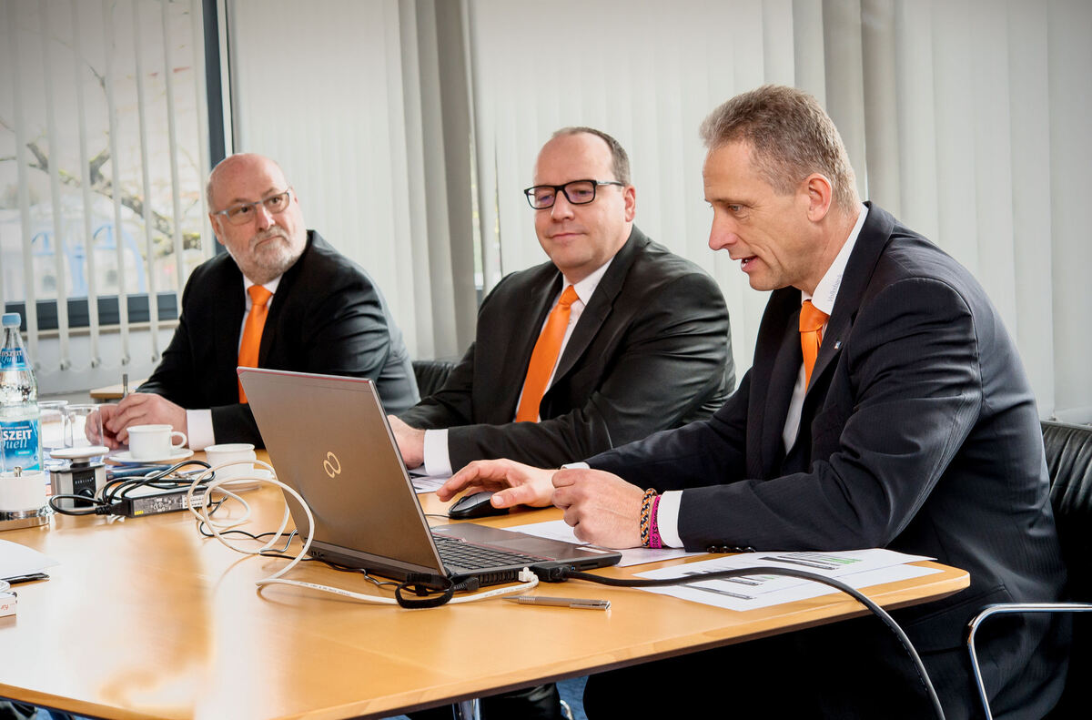 Vorstandsvorsitzender Martin Schnitzler (rechts) und die Vorstandsmitglieder Michael Stadelmaier (Mitte) und Karl Herrmann stellten die 2017er-Zahlen der Volksbank Ermstal-Alb vor. FOTO: TRINKHAUS