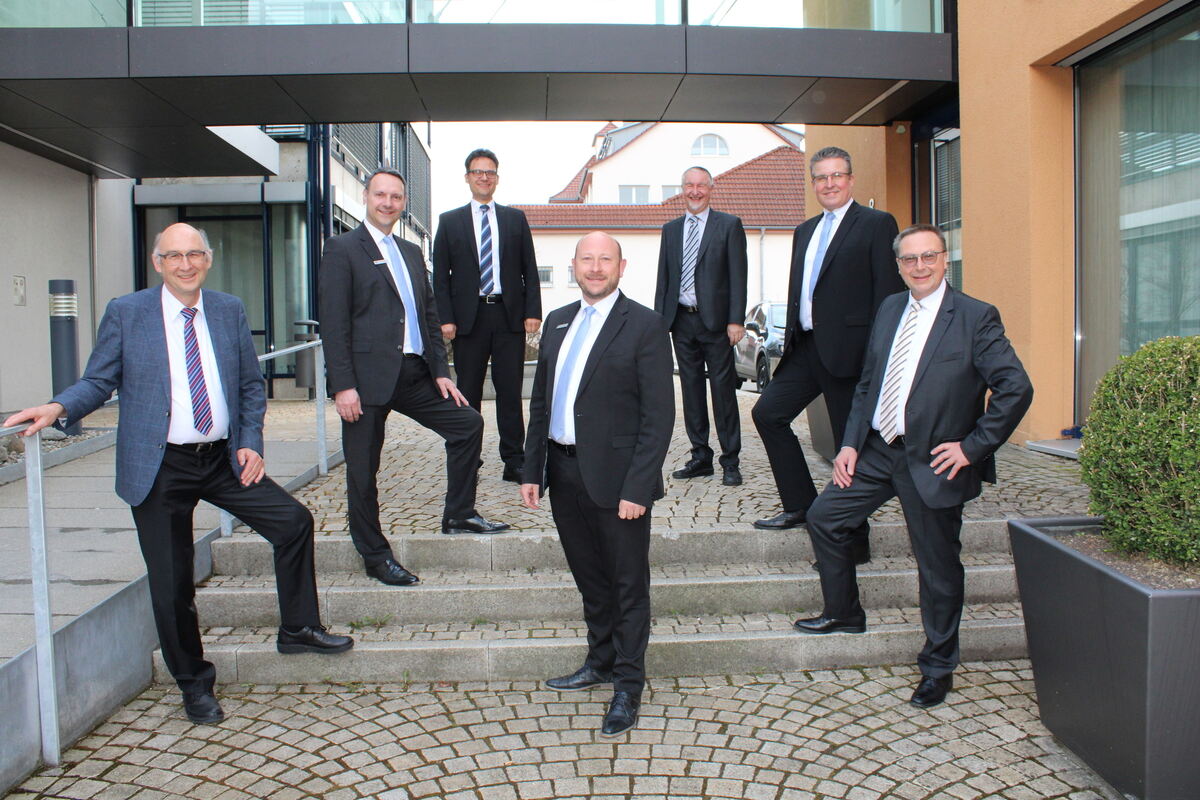 Die Verantwortlichen der Volksbank Münsingen und der Raiffeisenbank Mehrstetten (von links): Rudolf Veitz, Darko Zubak, Holger Haible, Christian Bückle, Werner Hagmaier, Andreas Deiß und Hubert Knupfer. FOTO: VOLKSBANK MÜNSINGEN