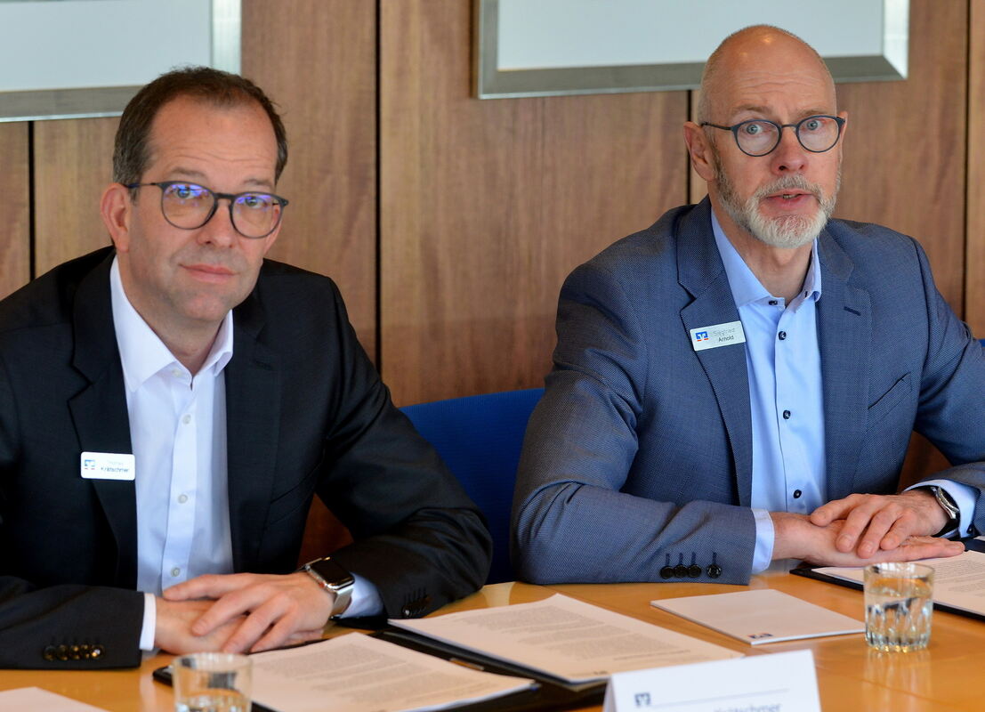 Vorstandsvorsitzender Siegfried Arnold (rechts) und Vorstandsmitglied Thomas Krätschmer berichteten über die Lage der Volksbank Reutlingen. FOTO: NIETHAMMER