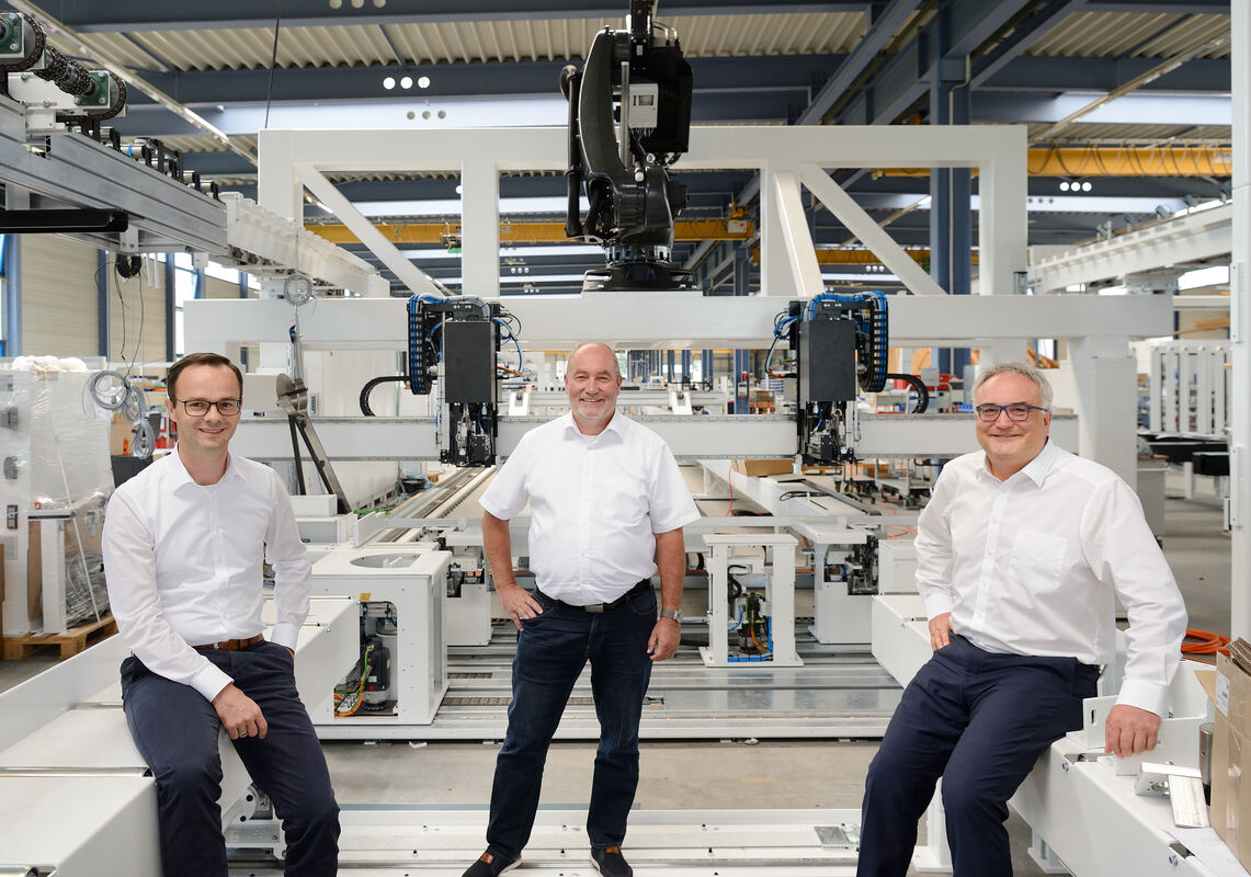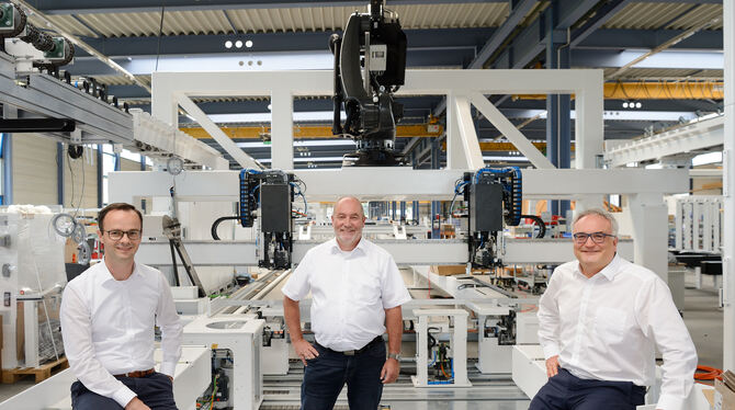 Die Geschäftsführer der Weinmann Holzbausystemtechnik GmbH (von links): Sven Schempp, Hansbert Ott und Josef Zerle. Die Produktionsanlage für einen Fertighaushersteller, in der sie fotografiert wurden, enthält »einen guten Schwarzarbeiter«, wie Schempp den schwarzen Roboter (oben Mitte) nennt. FOTO: PIETH