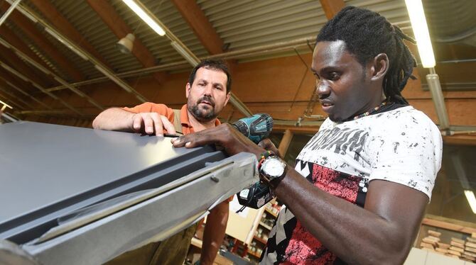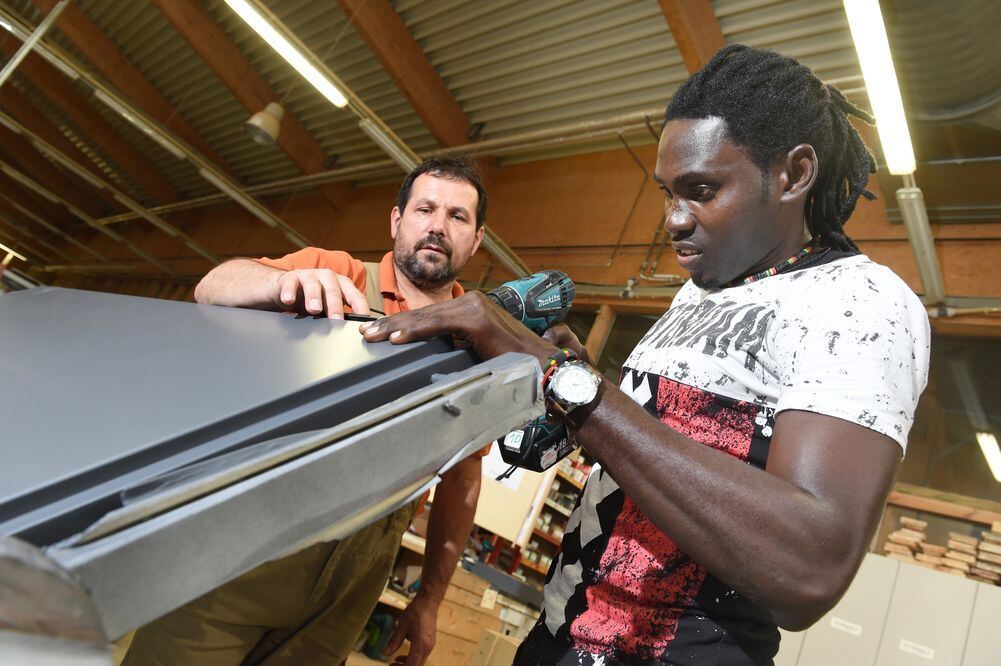 Asylbewerber Omar Ceesay (r) arbeitet am 27.08.2015 in der Schreinerei Holitsch in Tettnang-Hiltensweiler (Baden-Württemberg) an einer Tür, Schreiner Karl-Heinz Kübler schaut dem künftigen Lehrling zu. Foto: Felix Kästle/dpa