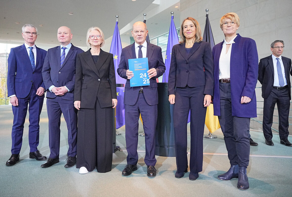 Bundeskanzler Olaf Scholz (SPD) hält das Jahresgutachten des Sachverständigenrates zur Begutachtung der gesamtwirtschaftlichen Entwicklung in der Hand, während die Mitglieder des Sachverständigenrats (von links) Martin Werding, Achim Truger, Monika Schnitzer (Vorsitzende), Ulrike Malmendier und Veronika Grimm neben ihm stehen. FOTO: KAPPELER/DPA