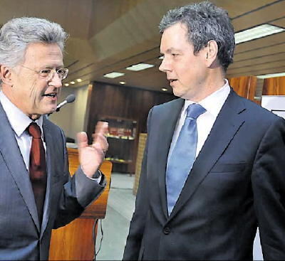Peter Bofinger (rechts) im Gespräch mit dem Chef der KSK Reutlingen, Eugen Schäufele, plädiert für eine Investitionszulage, sollte die Krise andauern.