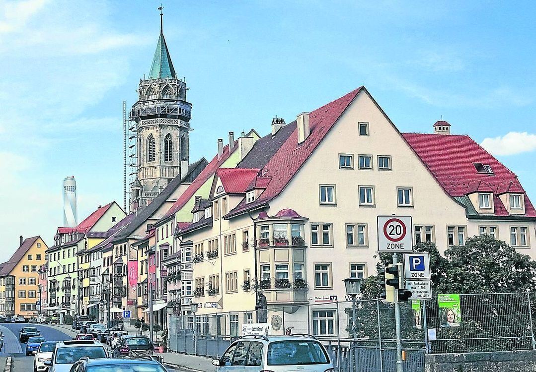 Der 244 Meter hohe Turm – hier links neben dem Kirchturm – außerhalb Rottweils wird nach dieser Skizze von der Stadtmitte aus so wahrgenommen. FOTO: THYSSEN-KRUPP