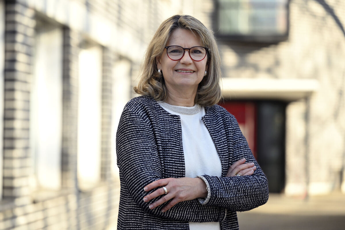 Sigrid Hilberath, neue Leiterin des Finanzamts Reutlingen, aufgenommen vor dem Eingang der Behörde.