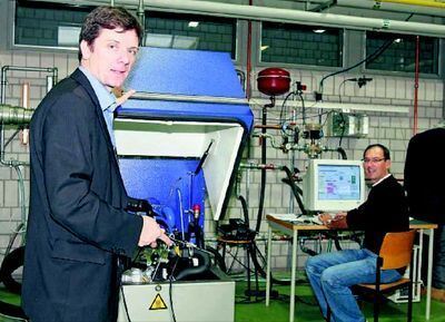 Bernd Thomas (links) und Labor-Ingenieur Siegfried Heinrich nehmen ein Mini-BHKW unter die Lupe.
