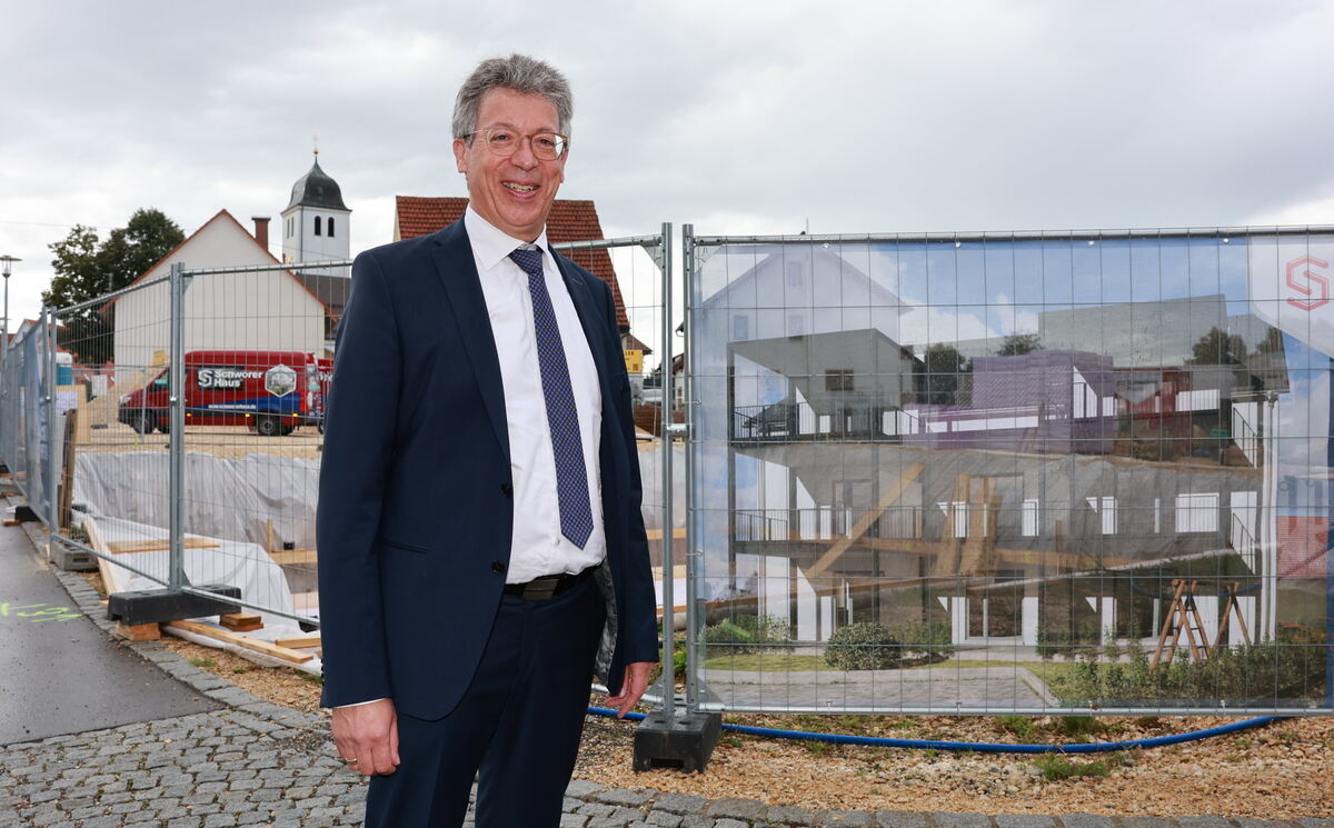 Johannes Schwörer, geschäftsführender Gesellschafter der Unternehmensgruppe Schwörer, aufgenommen vor einer Baustelle in der Ortsmitte von Hohenstein-Oberstetten. Dort entsteht ein Haus mit acht Wohnungen.