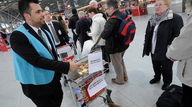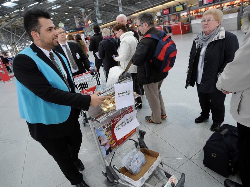 Ein Mitarbeiter des Köln Bonn Airport verteilt Süßigkeiten an wartende Passagiere. Foto: Henning Kaiser