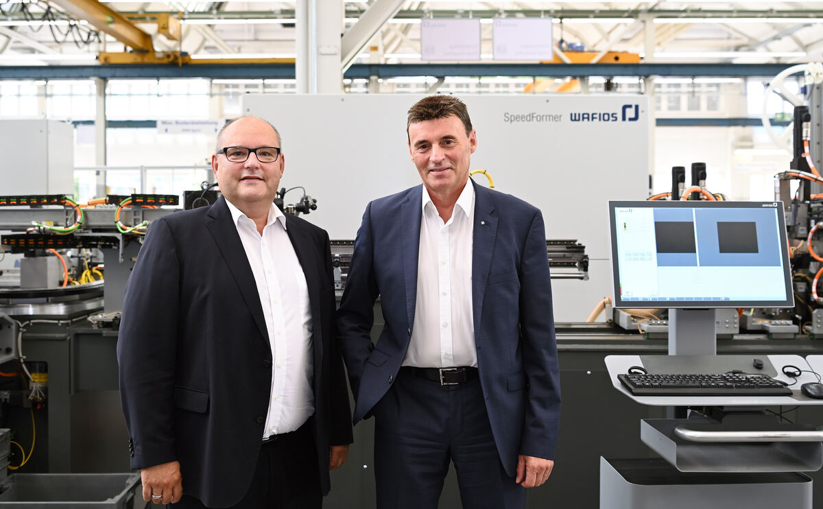 Vorstandssprecher Uwe-Peter Weigmann (links) und Vorstandsmitglied Martin Holder von der Wafios AG vor dem Speedformer des Unternehmens für die Fertigung von Stator-Hairpins, wichtige Bauteile von Elektromotoren.