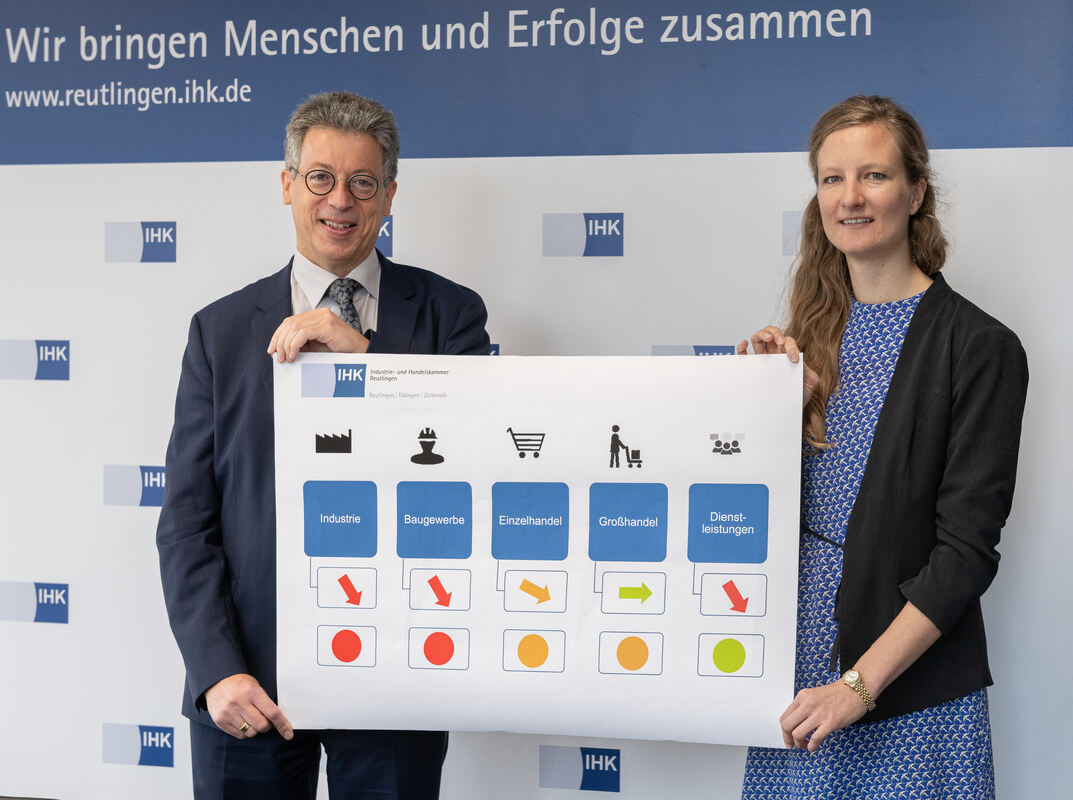 Vizepräsident Johannes Schwörer und Konjunkturexpertin Antonia Hettinger stellten die Ergebnisse einer Umfrage unter Mitgliedsunternehmen der Industrie- und Handelskammer Reutlingen vor.