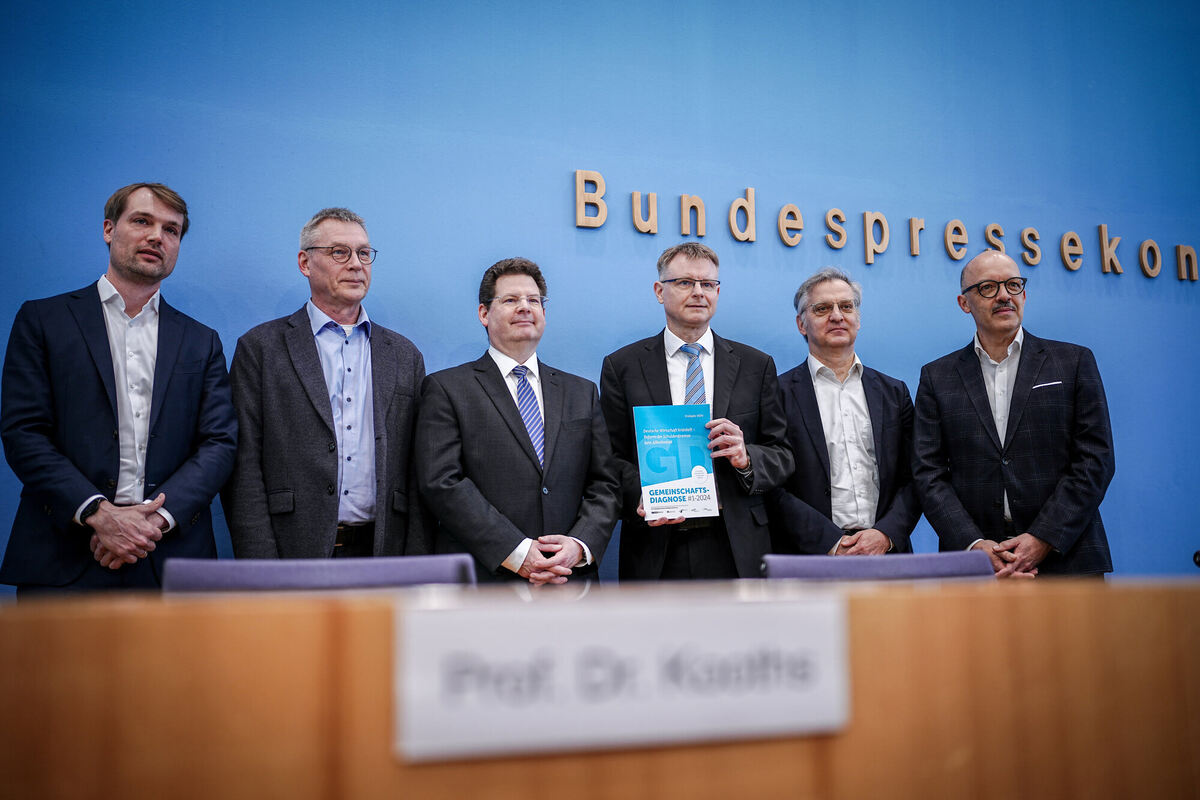 Wirtschaftsforschungsinstitute geben Gemeinschaftsdiagnose bekannt (von links): Timm Bönke, Deutsches Institut für Wirtschaftsforschung (DIW Berlin), Oliver Holtemöller, Leibniz-Institut für Wirtschaftsforschung Halle (IWH), Klaus-Jürgen Gern, Kiel Institut für Weltwirtschaft (IfW Kiel), Stefan Kooths, Kiel Institut für Weltwirtschaft, Torsten Schmidt, RWI Leibniz-Institut für Wirtschaftsforschung, Essen, und Timo Wollmershäuser, Ifo-Institut Leibniz-Institut für Wirtschaftsforschung an der Universität München. FOTO: NIETFELD/DPA
