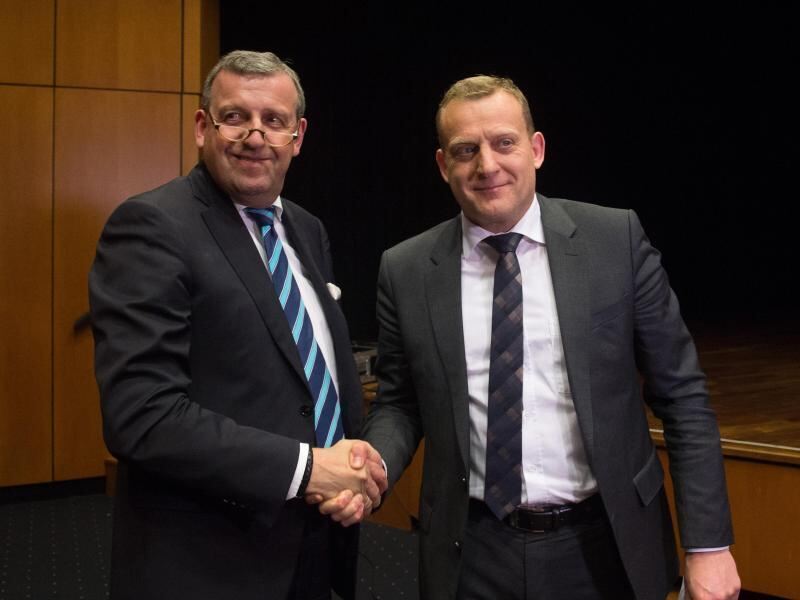Der Bezirksleiter des IG Metall-Bezirks Baden-Württemberg, Roman Zitzelsberger (r) und der Vorsitzende von Südwestmetall, Stefan Wolf reichen sich in Böblingen die Hand. Foto: Marijan Murat