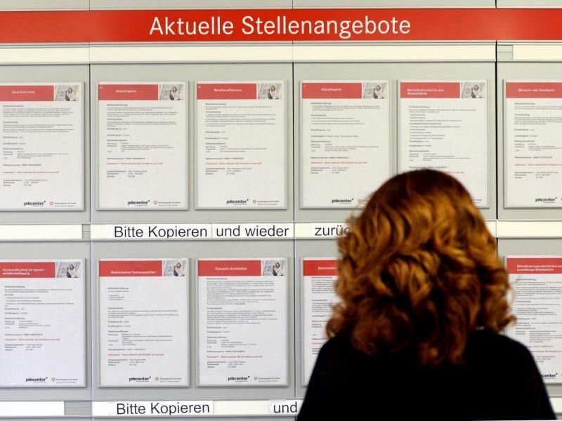 Eine Frau betrachtet in einer Arbeitsagentur aktuelle Stellenangebote. Foto: Ralf Hirschberger / Illustration