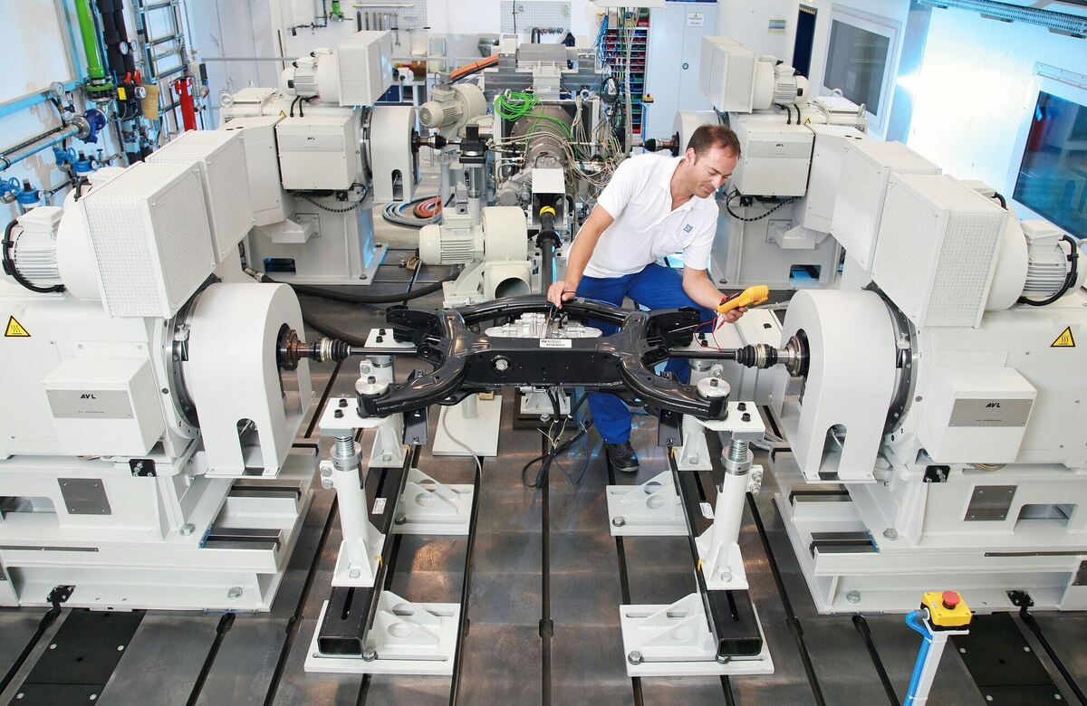 Ein Mitarbeiter arbeitet am Prüfstand für Getriebe im ZF-Werk in Friedrichshafen. FOTO: ZF