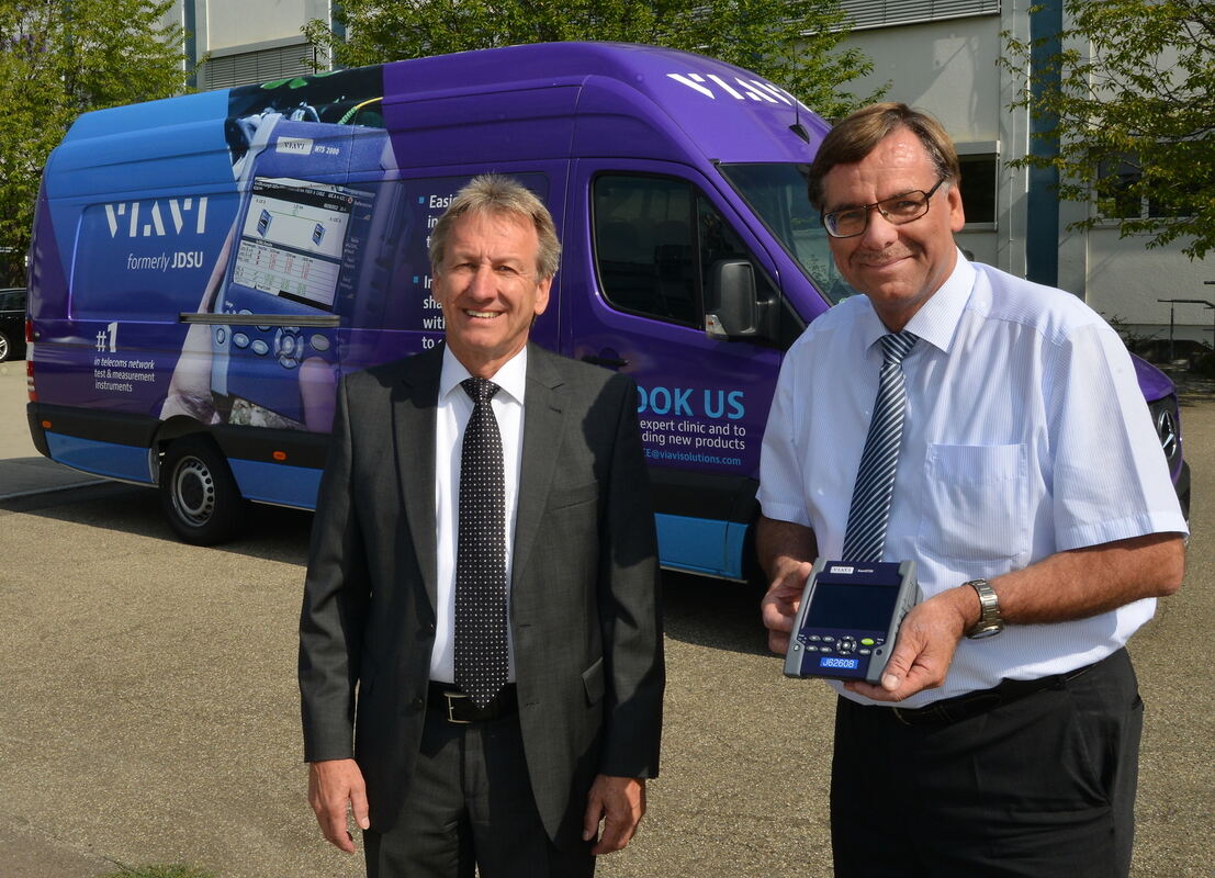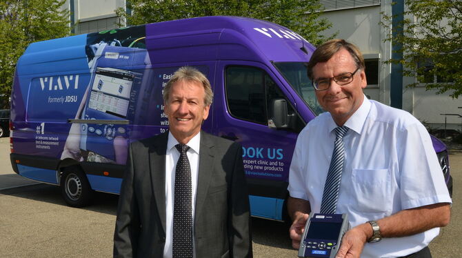 Geschäftsführer Rolf Trieflinger (links) und Entwicklungschef Dietmar Tandler von Viavi Solutions Deutschland vor einem Präsentationsfahrzeug des Unternehmens, das GEA-Leser eher unter der früheren Firmierung Wandel & Goltermann kennen dürften. FOTO: NIETHAMMER