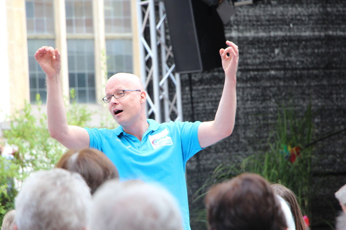 Martin Kohler, als er 2017 am ökumenischen Stadtkirchentag auf dem Pfullinger Marktplatz den Kirchenchor dirigierte. Der ist mit den Jahren geschrumpft: von anfangs 45 auf nun 20 Sängerinnen und Sänger. »Es kommen weniger nach als wegfallen«, so Kohler. FOTO: PRIVAT