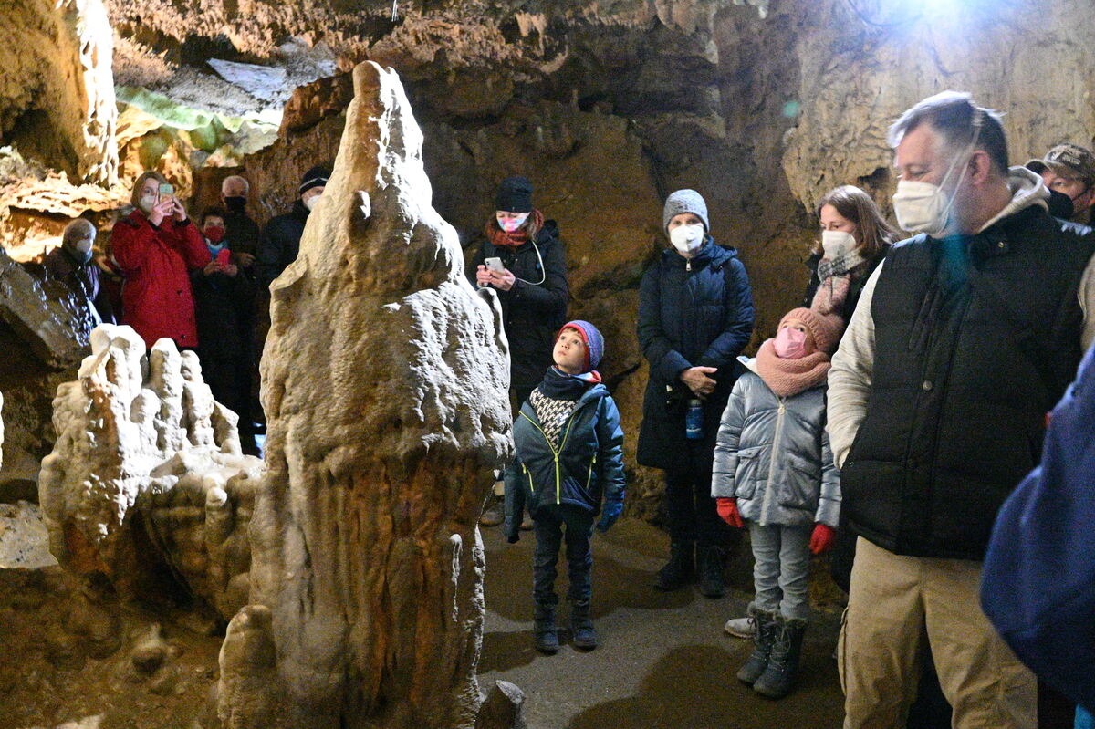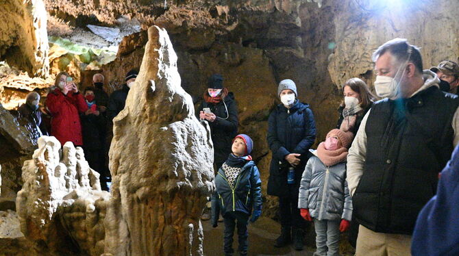 Kinder und Erwachsene geraten gleichermaßen ins Staunen angesichts der mächtigen Tropfsteine in der Bärenhöhle. FOTO: GEIGER
