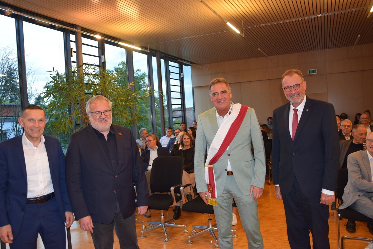 Mit neuer Schärpe kann er jetzt mit dem Kollegen der italienischen Partnergemeinde Mezzocorona mithalten (von links): Bürgermeister Gunter Schmid aus Neustetten, Hölschs Stellvertreter Harald Müller, Thomas Hölsch und Landrat Joachim Walter.