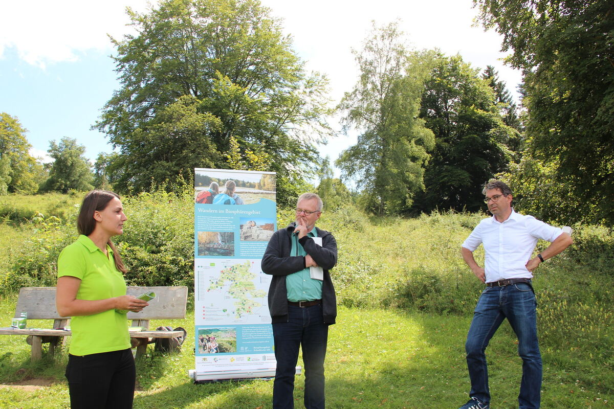 Larissa Großberger von der Geschäftsstelle der »Hochgehberge« mit dem Umwelt-Staatssekretär Andre Baumann (rechts) und Dietmar Enkel vom Referat Umwelt im Tübinger Regierungspräsidium. Der Münsinger Beutenlay ist die erste Fläche, die mit der Hilfe von Spenden der Wanderer gepflegt werden kann. FOTO: DEWALD