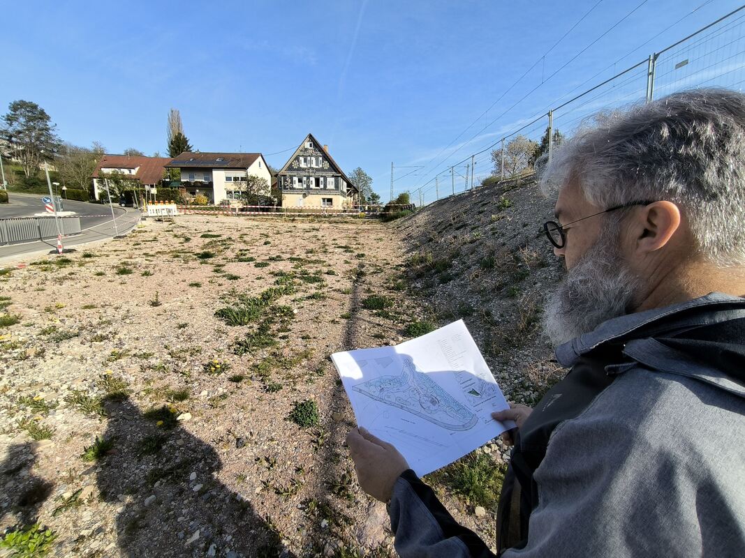 Wannweils Ortsbaumeister Carsten Göhner weiß jetzt schon, wie die Grünanlage »In der Au« aussehen wird, wenn sie die Deutsche Bahn hergerichtet hat. Hier schaut er vor Ort in den Plan der Planungsgruppe Stahlecker (Stuttgart).