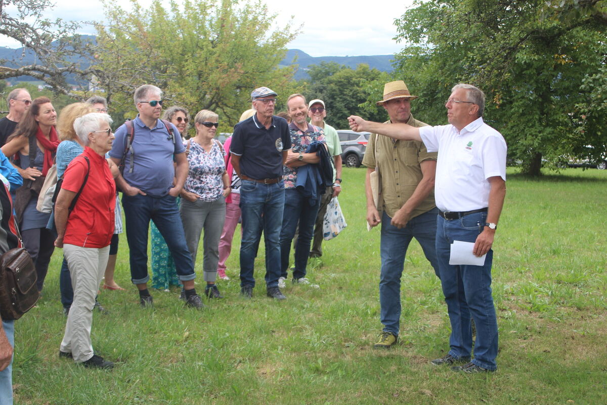Willy Junger vom OGV Stockach (weißes Hemd) und Joachim Löckelt (mit Hut) führten durch die Stockacher Streuobstwiesen.