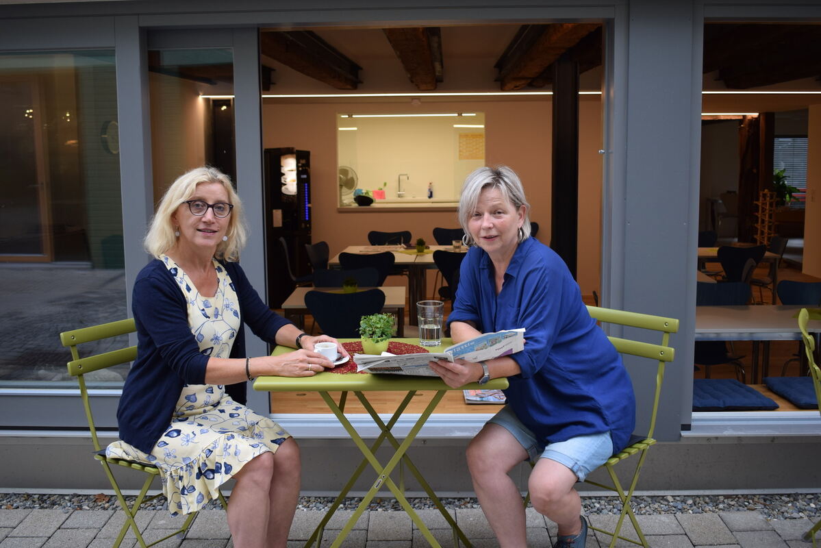 Besprechung vorm Haus mit Blick ins Café des neuen Familienzentrums in der Pfleghofstraße in Metzingen: Christa Herter-Dank und Martina De Rubeis. FOTO: FÜSSEL
