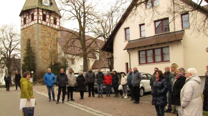Treffpunkt Kirche: Gemeinderätin Roswita Decker Röckel (links) mit rund 30 Interessierten auf Gustav Werners Spuren in Walddorfhäslach. Foto: Veit Müller