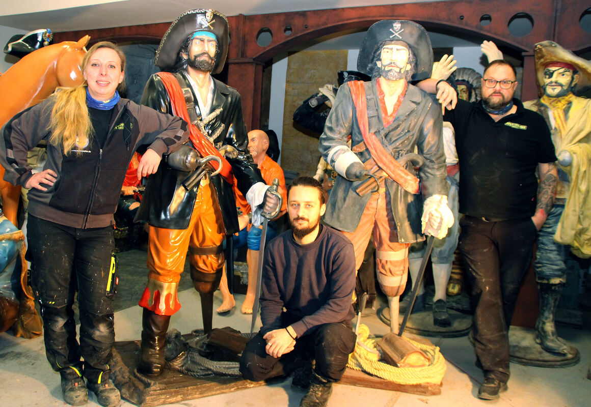 Ute Worschischek und Ralf Schmied vom »Art-Team Work« inmitten schon restaurierter oder noch zu verschönernden Figuren. Der Tübinger Künstler Teo Morar (Mitte) hilft mit. FOTO: LEIPPERT
