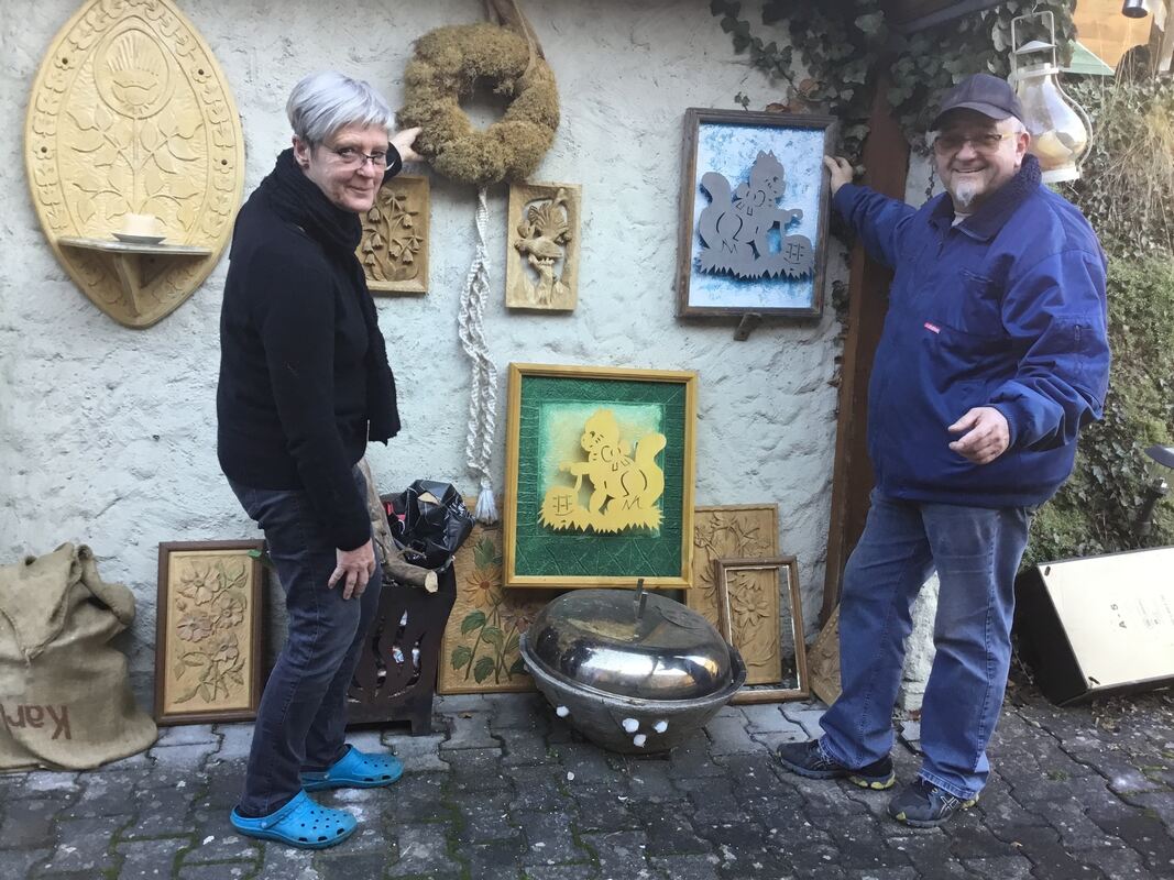 Petra Luft hält in Haus und Garten all die Schätze in Ehren, die der Gomadinger Karl Leuze geschaffen hat und auf die auch sein Sohn Bernd stolz ist.