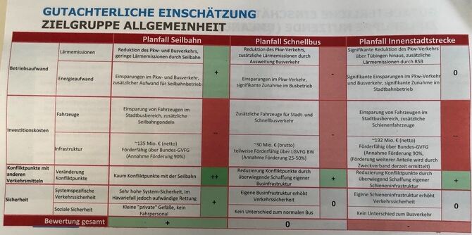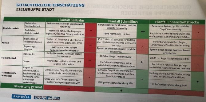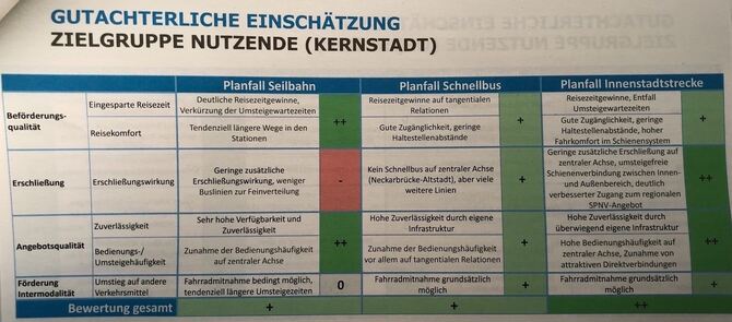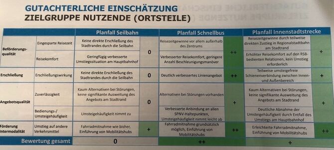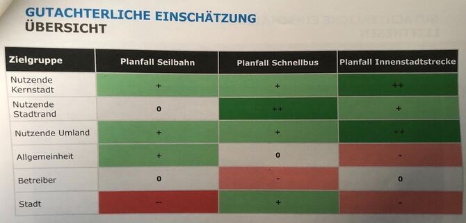 Bei der Zielgruppe »Allgemeinheit« schneidet die Regionalstadtbahn am schlechtesten ab, was vor allem an den hohen Investitionskosten liegt. 192 Millionen Euro netto soll die Innenstadtstrecke kosten, wobei 90 Prozent von Bund und Land gefördert werden. Die Kosten für ein Schnellbussystem werden mit 30 Millionen Euro veranschlagt, 25 bis 50 Prozent sind hier förderfähig. Eine Seilbahn soll 135 Millionen Euro kosten, 90 Prozent könnten gefördert werden. Die Seilbahn schneidet trotz der höheren Investitionskosten als der Schnellbus in diesem Vergleich am besten ab, da diese kaum »Konfliktpunkte mit anderen Verkehrsmitteln« hat.