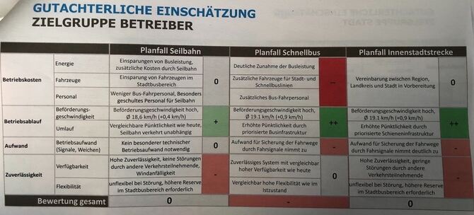Aus Sicht der Zielgruppe »Betreiber« sind Seilbahn und Stadtbahn gleichauf vorne. Der Schnellbus hat im Vergleich die deutlich höheren Betriebskosten.