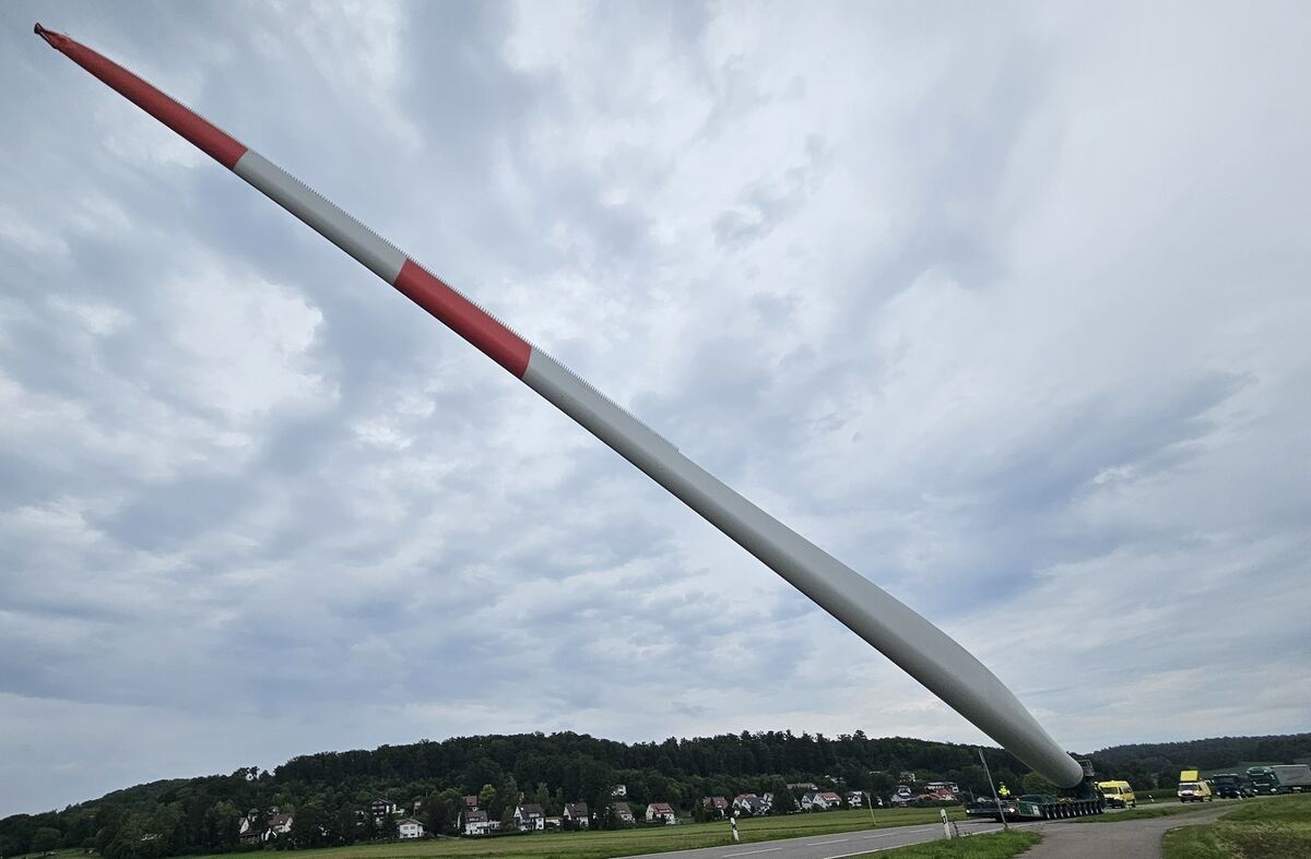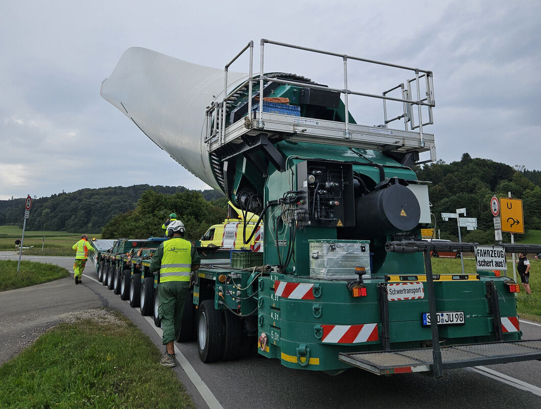 Die Türme sind bis zu 95 Tonnen schwer, je nach Turmteil sind sie bis zu 33 Meter lang und bis zu 4,5 Meter hoch und breit. Wenn die Teile über die Alb gefahren werden, haben sie schon eine lange Reise hinter sich: Sie kommen aus Dänemark und Tschechien. Für den Transport mussten an der Strecke Verkehrszeichen und Leitplanken abmontiert, Ampeln gedreht und Halteverbote aufgestellt werden. Außerdem braucht man eine Transportgenehmigung, und es mussten Freischnitte gemacht werden. Die Montage der Windräder beginnt Anfang Oktober. (GEA)