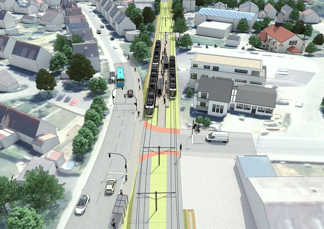 Die Visualisierung zeigt die Alte Bahntrasse mit dem Haltepunkt Süd beim Haldenäckerweg.