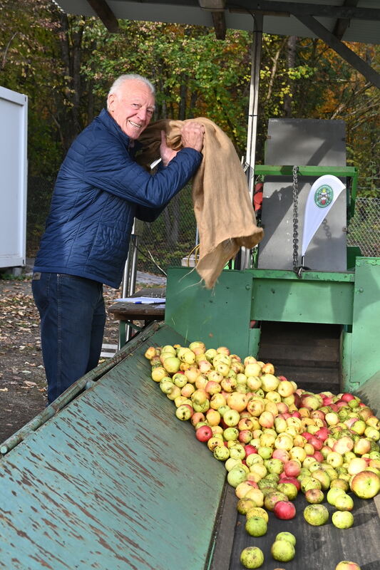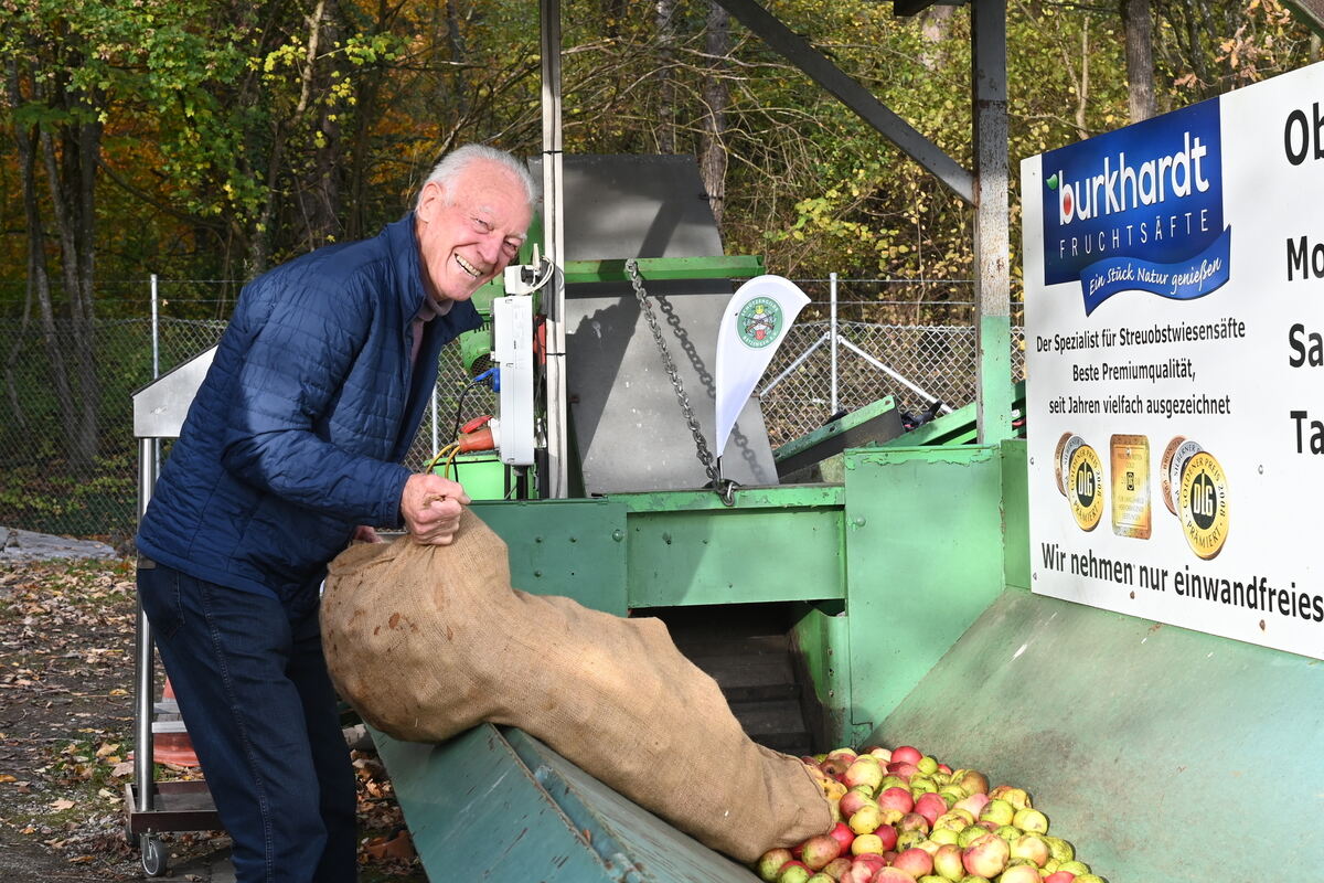 Fritz Pfingsttag lässt seine Äpfel an der Streuobst-Annahmestelle der Schützengilde Betzingen aus dem Sack.