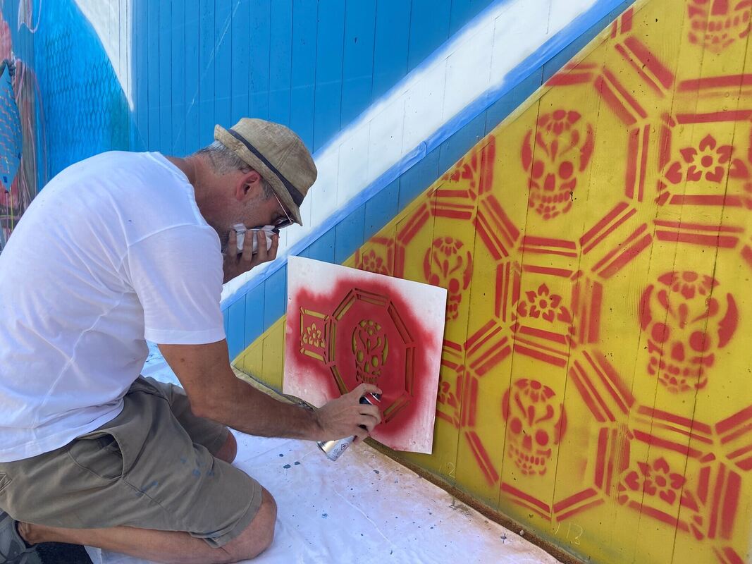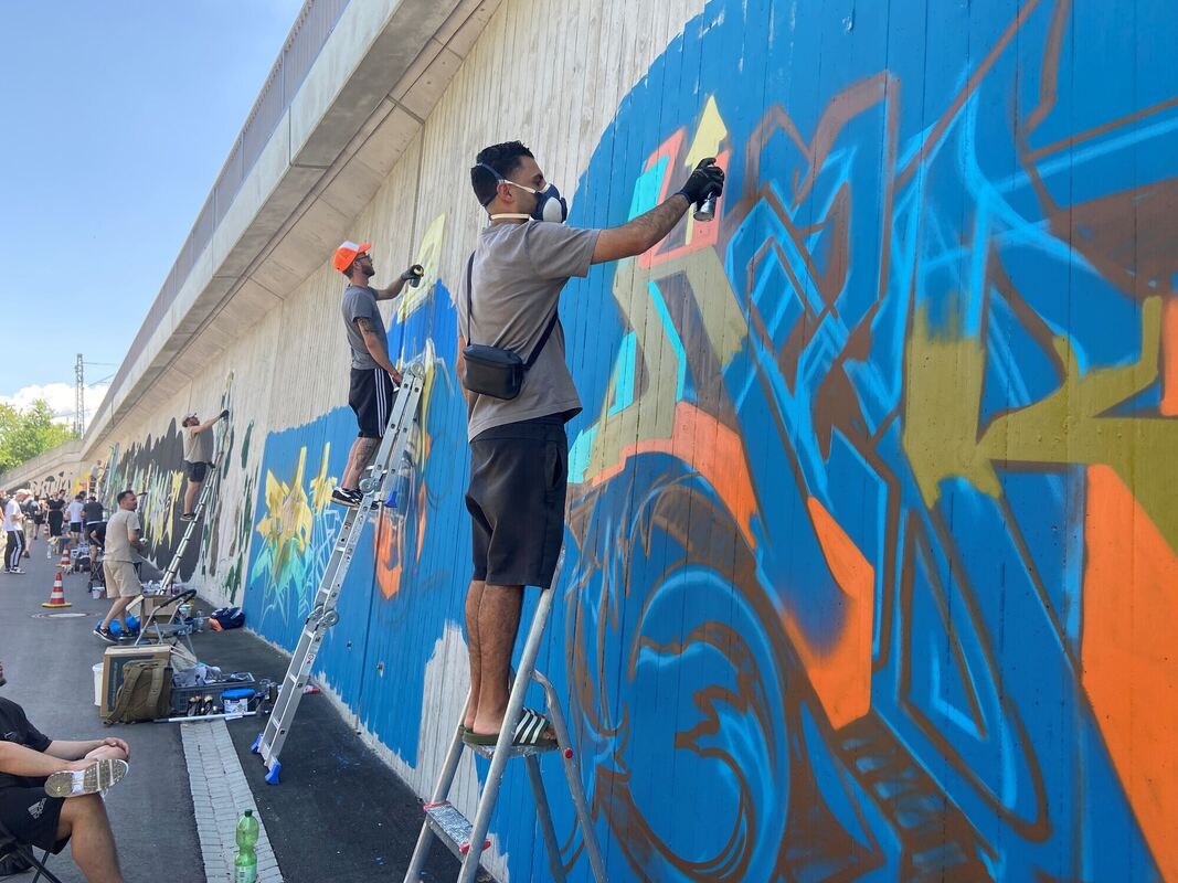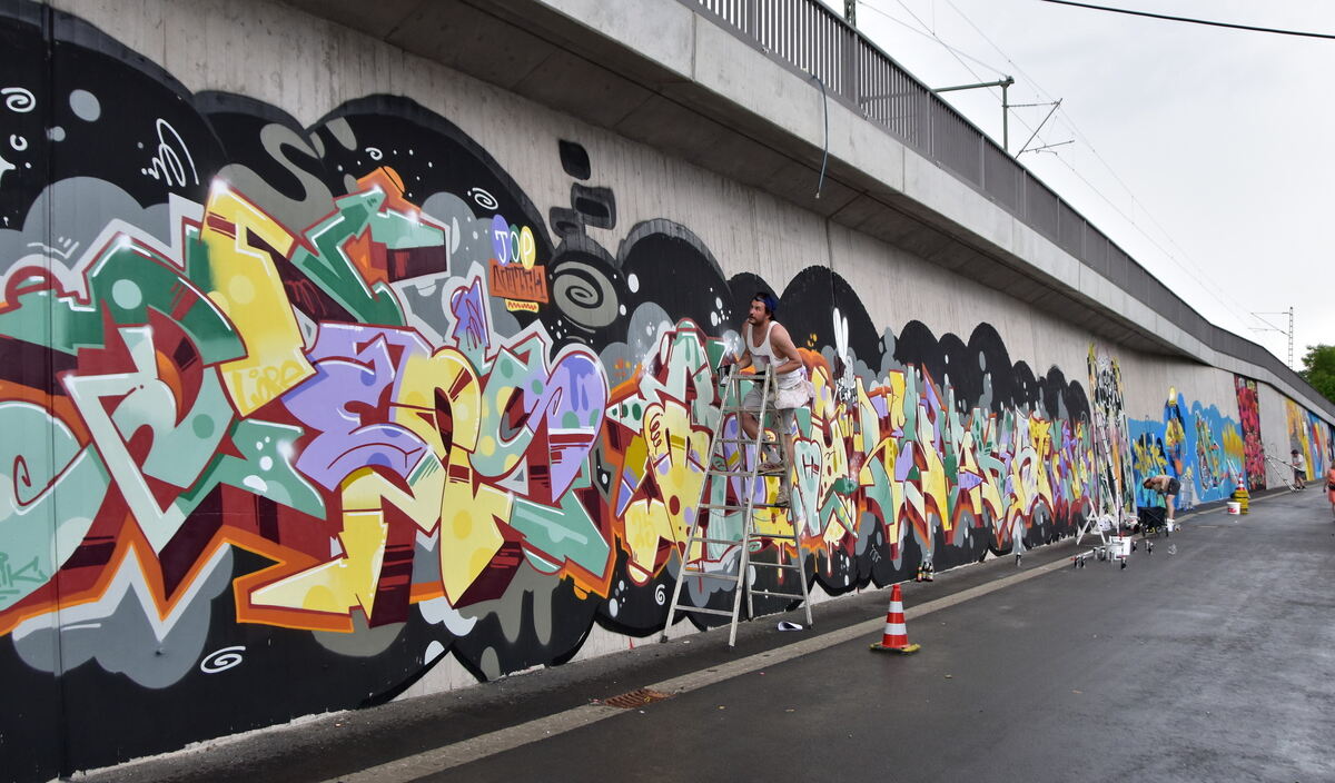 Fast vollendet: Graffiti-Spayer verwandeln bei »urbana rt.« die Betzinger Bahnmauer in ein buntes Gesamtkunstwerk.