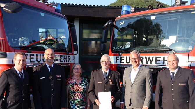 Von links: Amtsleitung Feuerwehr Reutlingen Stefan Hermann und Frank Wittel, Bezirksbürgermeisterin Christel Pahl, Wilfried Rempfer, Finanzbürgermeister der Stadt Reutlingen Roland Wintzen und Kommandant Alexander Barth FOTOS: MEK