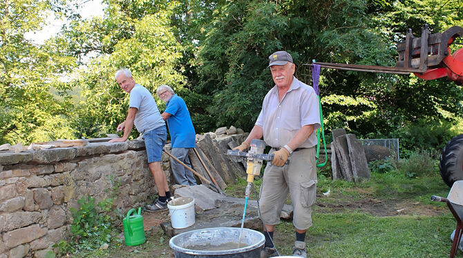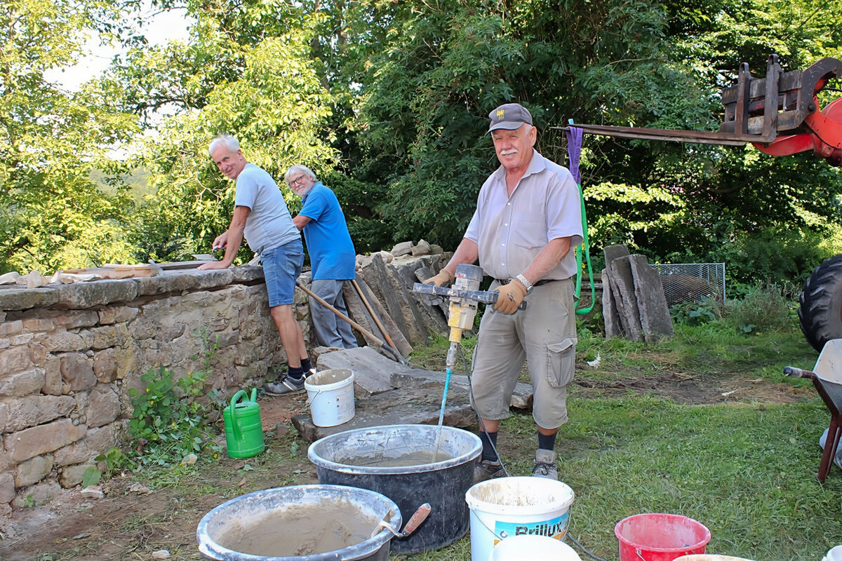 »Die Mauer ist historisch, alles musste vorher mit dem Denkmalamt abgesprochen werden«, berichtet Maurermeister Walter Mayer. Zusammen mit Ulrich »Ulli« Knecht und Kirchengemeinderat Otto Galster baute er die Schalenmauer zunächst ab. Sie besteht aus zwei sorgfältig gesetzten Sichtmauern, den »Schalen«, und einem mit kleineren Steinen und Abfallmaterial ausgefüllten Hohlraum dazwischen. Von Grund auf musste sie mit Trasszement und zwei Sorten Kalk wieder hochgemauert werden. Schwere Steinplatten decken die Oberseite gegen Regen ab. Wie es aussehen wird, wenn alles fertig ist, kann man auf der gegenüberliegenden Seite sehen. Hier ist die Mauer wieder stabil und hat ihren ursprünglichen Charme des Bruchsteinmauerwerks bewahrt. (GEA)