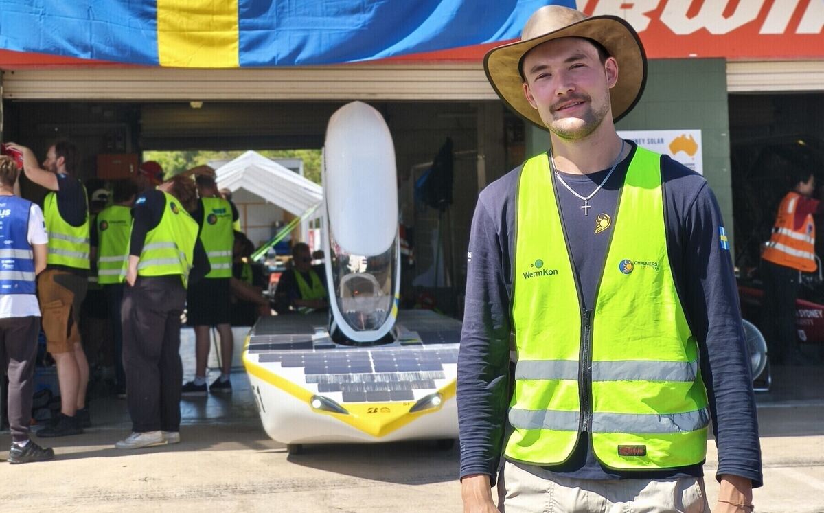 Daniel Uphoff vor dem Solarfahrzeug des Chalmers Solar Teams.