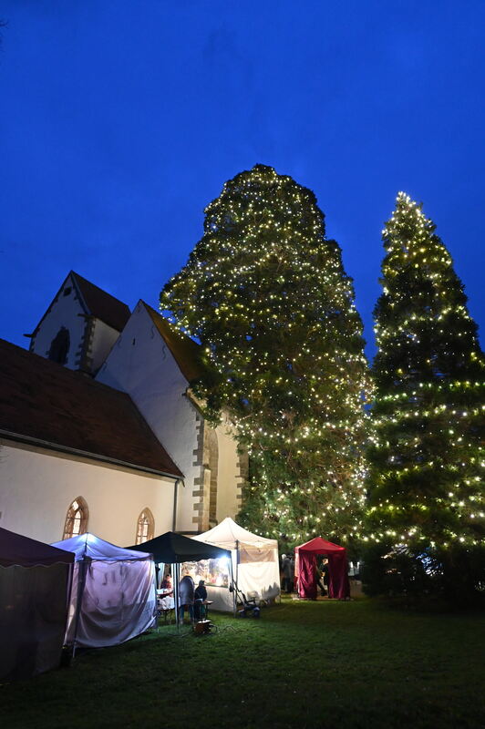 Noch höher ist freilich der Mammutbaum vor der Bronnweiler Marienkirche, der zudem extra für den Weihnachtsmarkt leuchtet. Rund um den über 35 Meter nach oben gewachsenen Stamm haben sich kuschelige Hütten gruppiert. Etwa die der »Stiftung Evangelische Marienkirche« oder vom »Bürgerverein Gönningen-Bronnweiler«. Offeriert werden Taschen mit Sternmotiven, Kränze, kleine genähte Tannenbäume oder andere entzückende Kleinigkeiten, die es sonst nirgendwo gibt. Die Feuerwehr bietet Rote Wurst im Weckle und Winzer-Glühwein. Um die Ecke spielt Oliver Stengel auf der Drehorgel. Bei Tagesmutter Ivana wird leckerer Kakao ausgeschenkt. Viele Familie tummeln sich vergnügt. Die Kinder haben alle Waffeln in der Hand. (GEA)