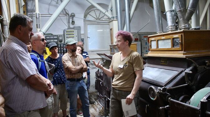Anlässlich des Mühlentags öffnete die Oferdinger Mühle an Pfingstmontag ihre Türen für ein interessiertes Publikum. Katharina Schoer (rechts) übernahm Führungen durch das dreigeschossige Gebäude.