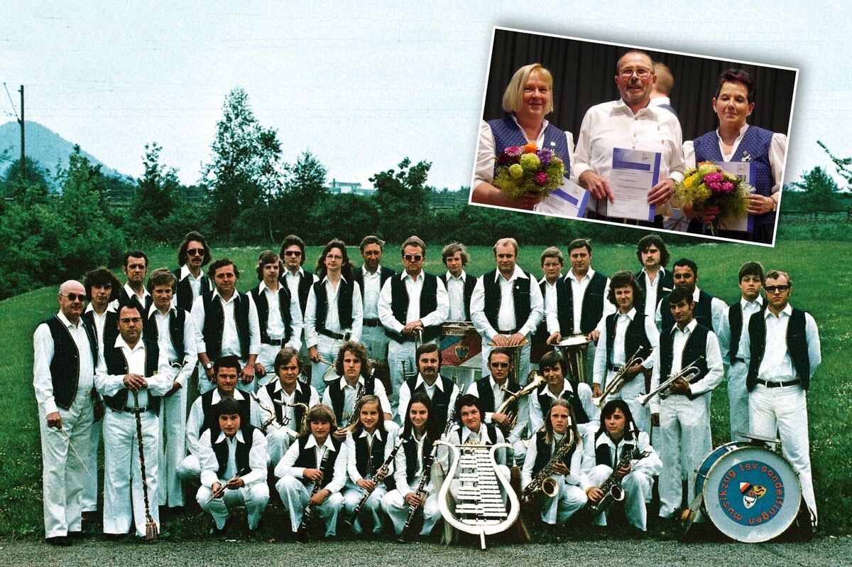 Ein halbes Jahrhundert Musik: Marion Krohmer, Ewald Glock und Gudrun Hölz als Geehrte beim jüngsten Konzert (im kleinen Bild von links) sowie 1976 als Nachwuchsmusiker (Zweiter von links) und junge Saxophonistinnen (vordere Reihe rechts). FOTOS: PRIVAT/SCHÄLE-SCHMITT