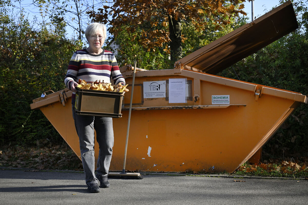 Edeltraut Stiedl, SPD-Stadträtin und eine der Aktiven der Initiative Igeloh, hilft bei der Aufsicht des Laubcontainers in Orschel-Hagen am ersten Öffnungstag.