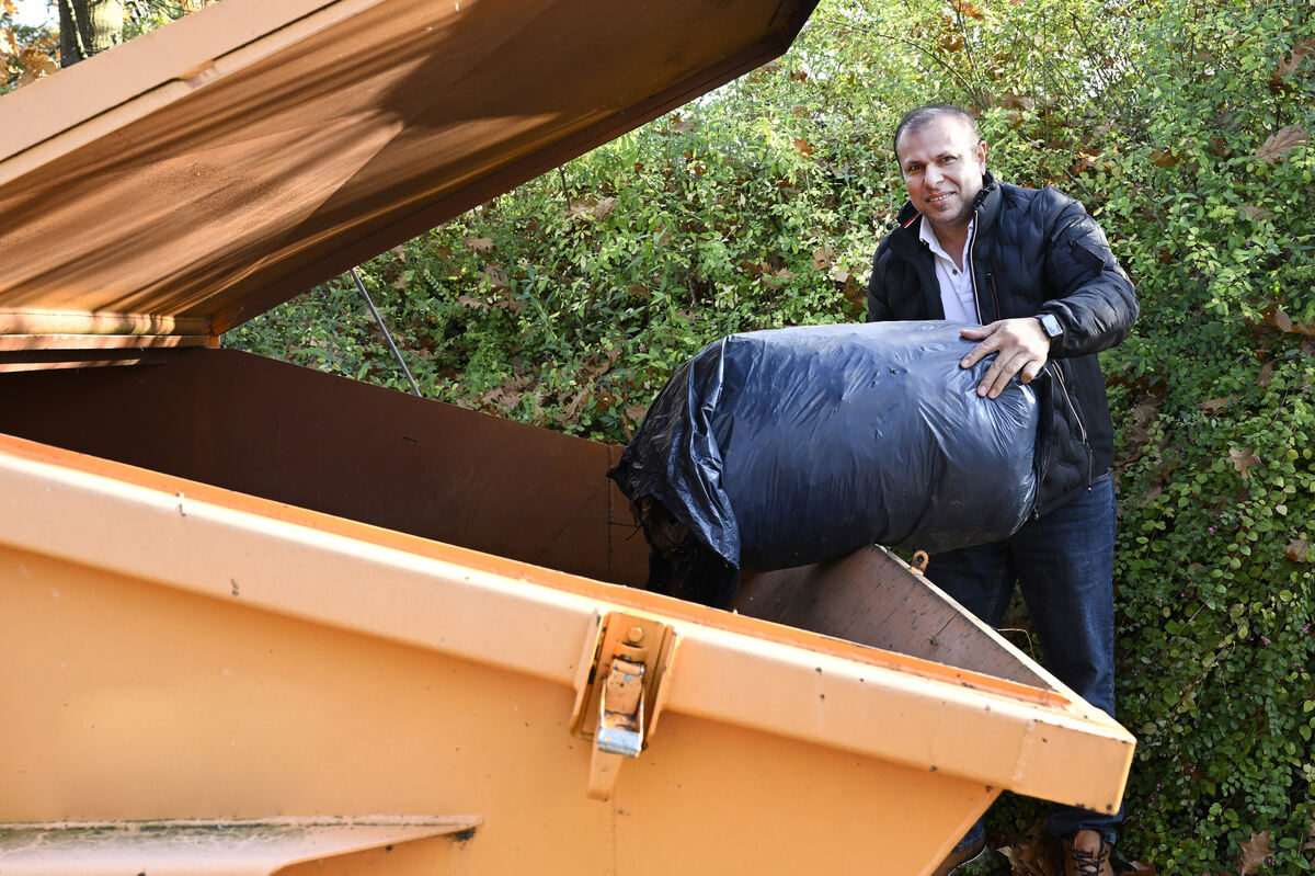 Ein Bürger entsorgt sein Laub in den von den TBR bereitgestellten Container am Belriner Ring 3.