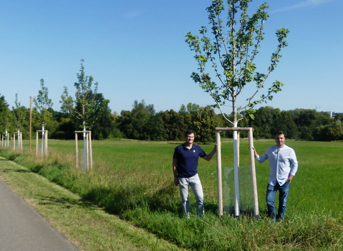 Georg Frey (links), Abteilungsleiter für Grünflächen und Umwelt, und Lucas Baum, Fachgebietsleiter für Grünflächenplanung, haben die Baumallee im Sportpark Markwasen geplant.