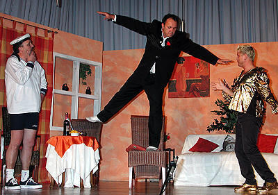 »Balkonszene, achter Stock« - Ladislaus (Klaus Widmann, Mitte) deklamiert Shakespeare. Otto Ofenloch (Klaus Hohlbein, links) und Detlef (Thomas Linster) sind beeindruckt.